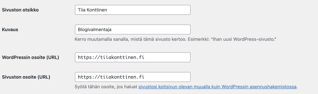 - Ylläpidon sähköpostiosoite: tarkista tai vaihda tähän se sähköpostiosoite, jota haluat käyttää. Esimerkiksi jos lisäät kotisivuille yhteydenottolomakkeen, sen viestit tulevat tähän osoitteeseen. Kun vaihdat osoitteen, siitä lähtee WordPressiltä sinulle vahvistussähköposti. Klikkaa viestissä olevaa linkkiä, niin osoite vaihtuu.