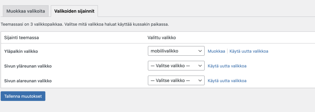 Ensin voit käydä katsomassa valikoiden sijainnit, kuinka monta niitä sinun teemassasi on. Tämän jälkeen valitse ”Muokkaa valikoita” ja luo ensimmäinen valikkosi.