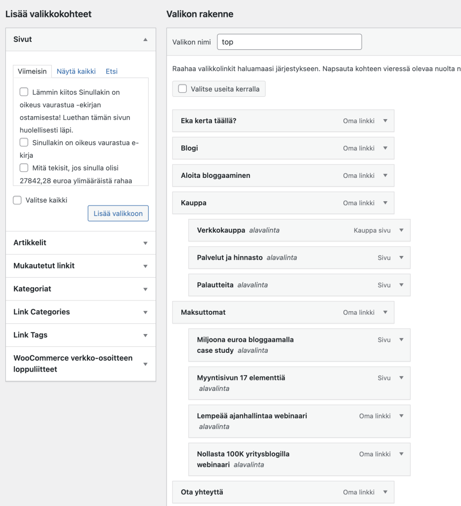 Sivut tulevat automaattisesti näkyvään ja voit etsiä niitä hakutermeillä. Kun olet lisännyt haluamasi sivut ja linkit valikkoon, voit ryhmitellä niitä halutessasi. Esimerkiksi alla olevassa kuvassa ”Kauppa” linkin alla on kolme muuta sivua. Olen vain hiirellä hieman siirtänyt näitä laatikoita oikealle, jotta ne ovat tulleet ”Kauppa” linkin alle. Jos menet tietokoneella kotisivuilleni ja klikkaat ”Kauppa” linkkiä, et pääse mihinkään mutta sen alapuolelle avautuu kolmen sivun alavalikko.