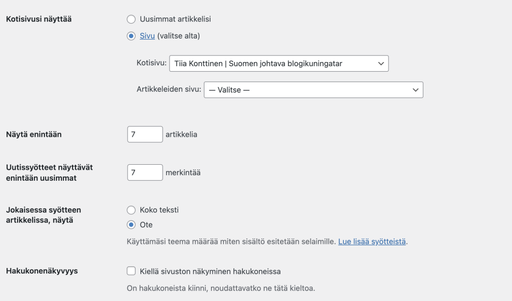 - Näytä enintään kohdassa valitse jotain 7 – 10 väliltä. Tämä tarkoittaa sitä, että mitä enemmän sinulla on blogitekstejä julkaistu, sitä useammalle sivulle ne menevät. Jokaisella sivulla on siis minun esimerkissäni 7 blogitekstiä. Kun olen julkaissut 54 blogitekstiä, sivuja on 8.