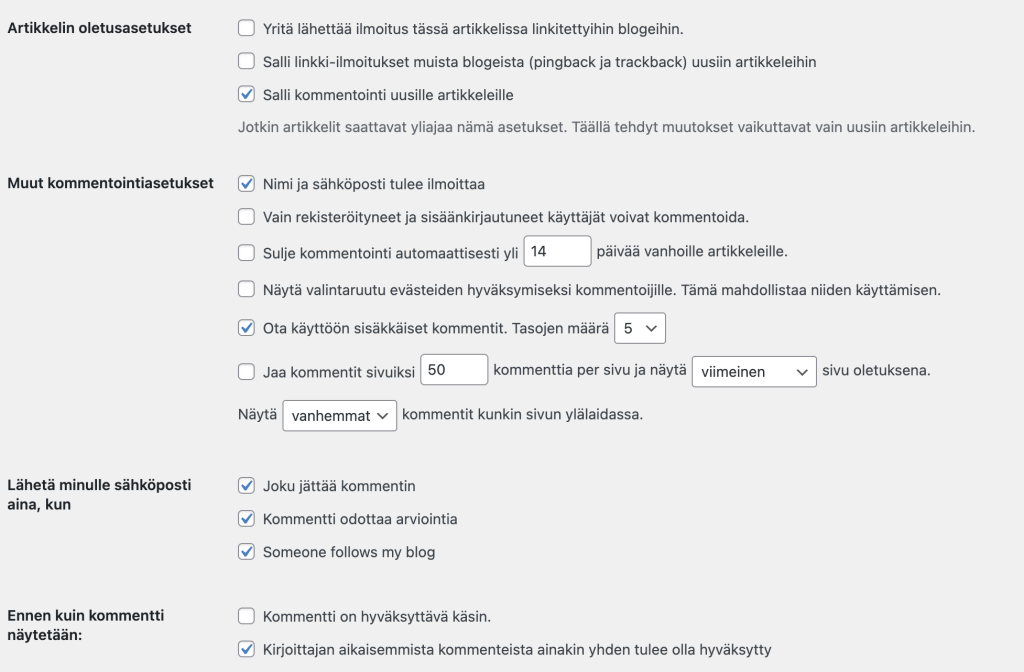 - Artikkelin oletusasetukset: jätä täppä ainoastaan ”Salli kommentointi uusille artikkeleille” kohtaan. Jos täppä on kahdessa ylimmässä, tästä voi aiheutua ikävä looppi, joka spämmää sinun kotisivujasi.