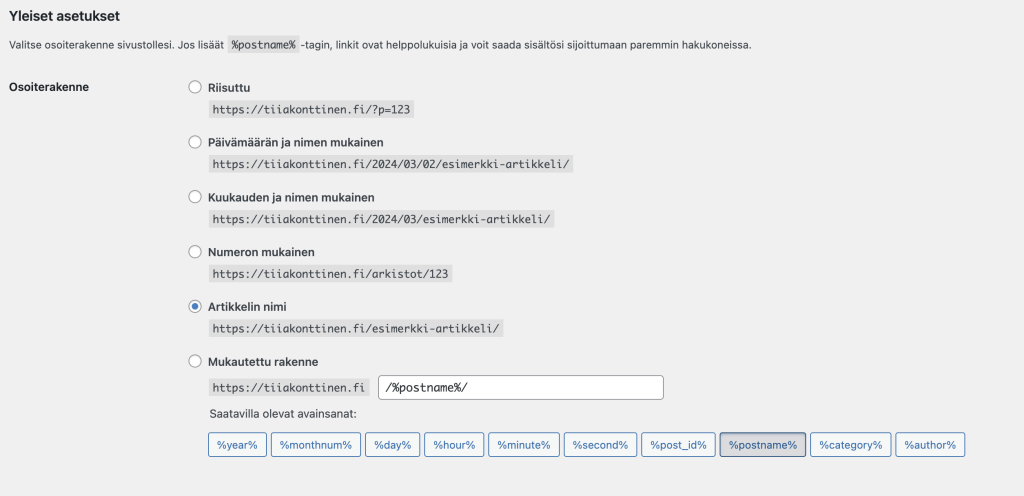 - Osoiterakenne: Valitse osoiterakenteeksi aina ”Artikkelin nimi”. Älä valitse päivämäärää, kuukautta tai riisuttua. Nämä vaikeuttavat olennaisesti kotisivujesi hakukoneoptimointia.