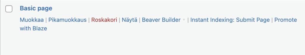 Sivujen luominen on helppoa ja nopeaa. Valitse vasemmalta linkkilistasta ”Sivut”. Todennäköisesti sinulle on luotu automaattisesti yksi sivu. En nyt tarkalleen muista minkä niminen se on, joten tein itselleni ”Basic Page” sivun ihan vain esimerkin omaisesti. Tätä sivua ei siis kannata jättää kotisivuille. Tämä johtuu siitä, että moni spämmääjä tietää, että wordressille luodaan tämä sivu, joten he pystyvät pommittamaan sivua spämmikommenteilla. Suosittelen siis, että klikkaa sivun alapuolella olevaa ”Roskakori” linkkiä. Linkki tulee näkyviin, kun viet hiiren sivun nimen päälle.