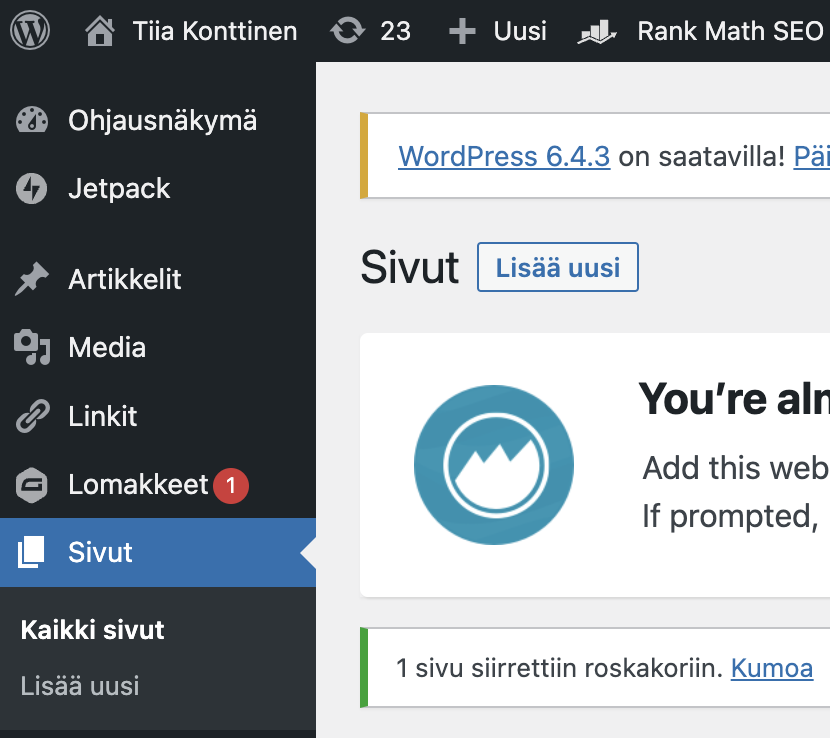 Sen jälkeen luodaan tarvittavat sivut. Voit lisätä sivuja joko sivuston ylälaidassa olevan ”Uusi” linkkiä klikkaamalla TAI hieman alempana olevaa ”Lisää uusi” painiketta painamalla TAI vasemmalla linkkilistassa olevaa ”Lisää uusi” linkkiä klikkaamalla, joka tulee Sivut ja Kaikki sivut linkkien alapuolelle. Ei väliä mitä käytät, jokaisesta saat saman toiminnon.
