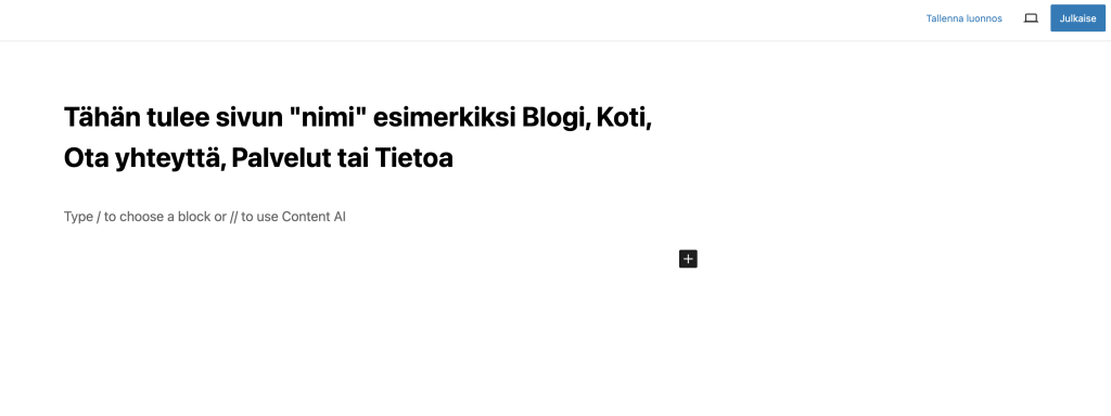 Seuraavaksi sivulle vain lisätään otsikko ja sivu julkaistaan. Siinä kaikki. Jokainen sivu luodaan erikseen. Tärkeimmät sivut ovat: