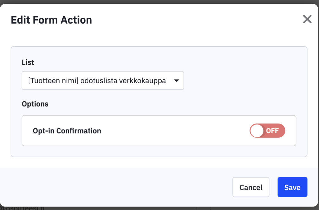 Form Action kohdassa tarkista vielä, että oikea lista on valittu. Klikkaamalla listan yläpuolella olevaa kynän kuvaa, pääset tarkistamaan onko lomakkeessa double opt-in valittu vai ei.