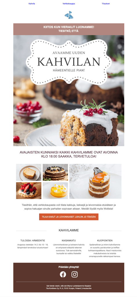 Active Campaignelta löytyy hyvin laajasti erilaisia valmiita sähköpostimalleja ja -pohjia, joita voit ottaa käyttöön ja vain päivittää sopimaan omaan brändiin. Kun muutaman tällaisen mallin tekee valmiiksi, voi malleja sitten kierrättää eri viesteissä. Alla on yksi esimerkki valmiista pohjasta, johon vain vaihdoin tekstit sekä ison kansikuvan.