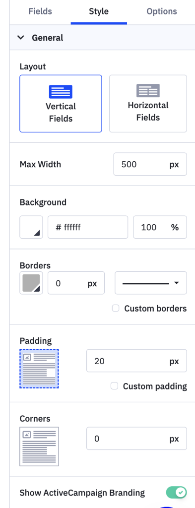Valitsen aina Vertical Fields, jotta laatikot tulevat allekkain näkyviin. Koska minulla on Active Campaignesta Plus-paketti, saan Active Campaignen logon käännettyä pois kohdasta Show ActiveCampaign Branding. Jos sinulla on Lite-versio, tätä mahdollisuutta ei ole.