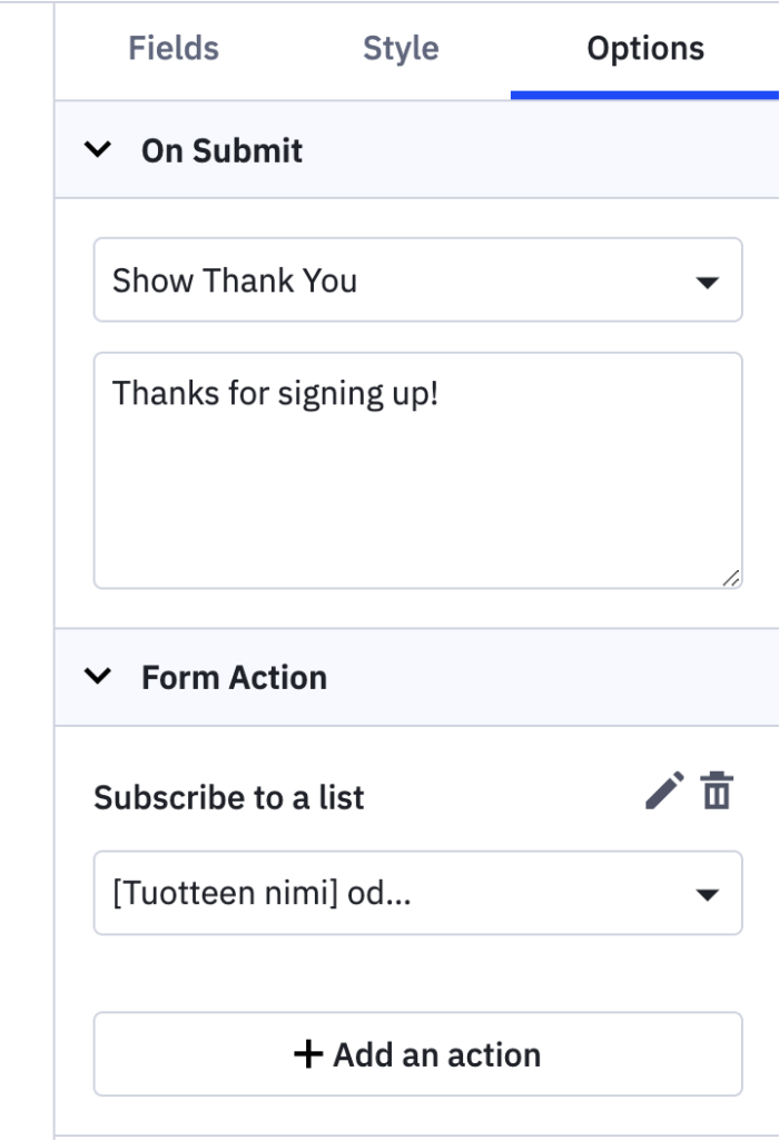 Kun lomake on valmis (toki lomakkeeseen voi lisätä myös kuvan, logon tai jotain muuta kivaa mutta itse pitäisi tämän mahdollisimman simppelinä), siirry Options-välilehdelle. Täällä voit joko ohjata henkilön erilliselle kiitos-sivulle tai voit kirjoittaa lyhyt tekstin sille varattuun laatikkoon (Thanks for signing up!”.
