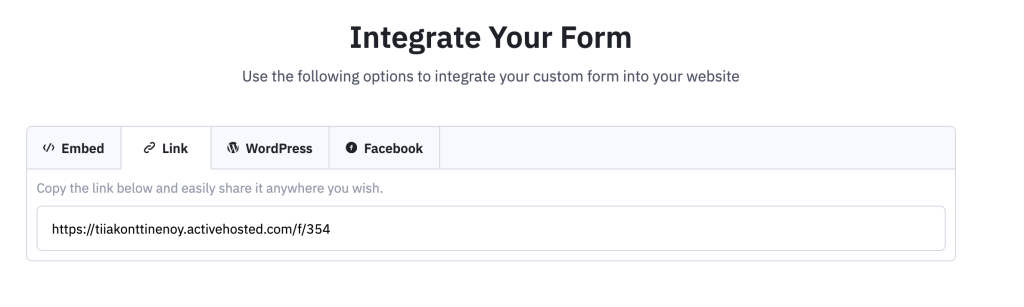 Tämän jälkeen klikkaa sivun oikeasta yläkulmasta Integrate painiketta, joka on sininen väriltään. Siirryt alla olevan kaltaiselle sivulle. Link välilehdeltä löydät linkin, joka lisätään QR-koodiin, blogitekstin alussa olevan videon mukaisesti.