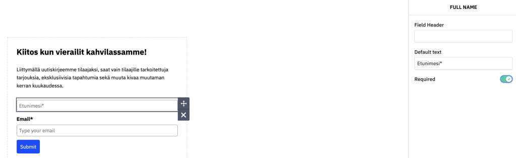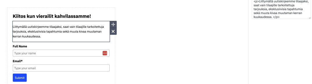 Seuraavaksi klikkaa nimeä ja pääset muokkaamaan tekstin suomeksi. Myös sähköpostiosoitteen voit muokata samalla tavalla klikkaamalla ensin hiirellä ja muokkaamassa tekstiä sivun oikeassa laidassa.