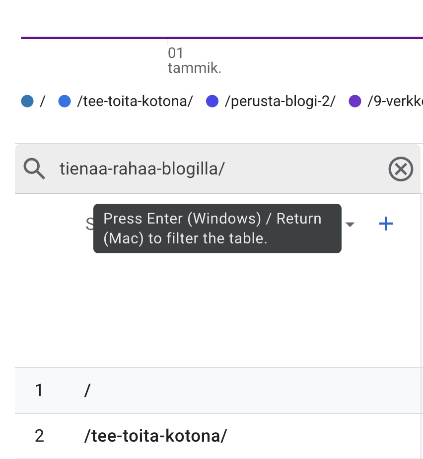 Seuraavaksi listaa esimerkiksi exceliin 15 luetuinta sivua ja/tai blogitekstiä luetuimmasta vähiten luetuimpaan. Lista on muuten oikea sellaisenaan mutta poistamme sieltä välistä etusivun, joka on yleensä vain / sekä blogi-sivun että kauppa-sivun. Haluamme tietää suoraan mitä blogitekstejä tai sivuja tällä hetkellä luetaan eniten.