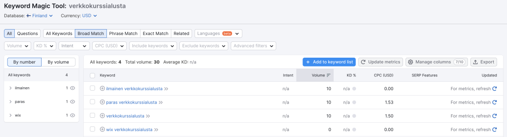 Pyri valitsemaan hakusanoja, joissa CPC sarakkeessa on jokin summa. Tämä tarkoittaa, että yritykset käyttävät rahaa tähän hakusanaan ja saavat sen kautta maksavia asiakkaita. Jos KD% sarakkeessa oleva pallura on tummanvihreä, kyseisellä hakusanalla on todella helppo päästä orgaanisessa hakutuloksissa korkealle. Sen sijaan jos väri on oranssi tai punainen, sitä vaikeampaa sillä hakusanalla on päästä Googlen ensimmäiselle sivulle.