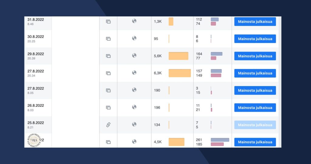 Esimerkiksi itse otin 3 kuukauden tilastot tietyistä blogiteksteistä sekä niiden liidimagneeteista, koska halusin nähdä, liittyykö jonkin blogitekstin kautta enemmän ihmisiä sähköpostilistalleni kuin jonkun toisen. Ja kun 3 kuukauden jälkeen näin trendin pysyvän samanlaisena, keskityin neljännen kuukauden aikana buustaamaan vain sitä yhtä blogitekstiä.