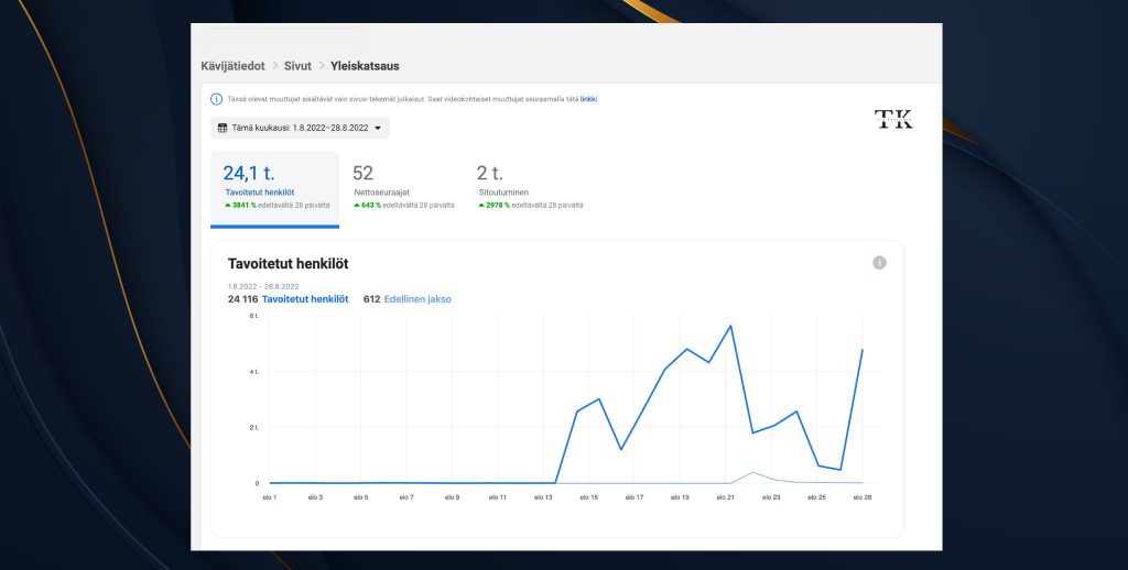 Mutta toki tämän kanssa pitää olla pitkäjänteinen. Olen useasti kuullut, että ei haluta käyttää aikaa orgaanisen somesisällön luomiseen. Mutta jos orgaanisella sisällöllä tavoitat 3 kuukauden aikana 24 100 ihmistä ja alat sen jälkeen mainostamaan heille, kuinka todennäköistä on, että heistä suurempi osa ostaa kuin jos mainostaisit FB / IG mainoksille samansuuruiselle koheryhmälle ilman, että he olisivat koskaan kuulletkaan sinusta?