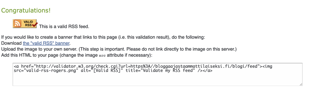 Voit halutessasi testata, että feedi toimii, menemällä tälle sivustolle (klikkaa tästä).