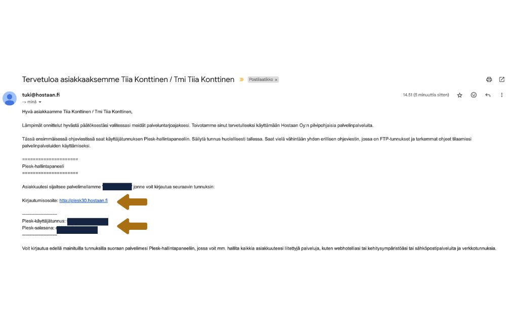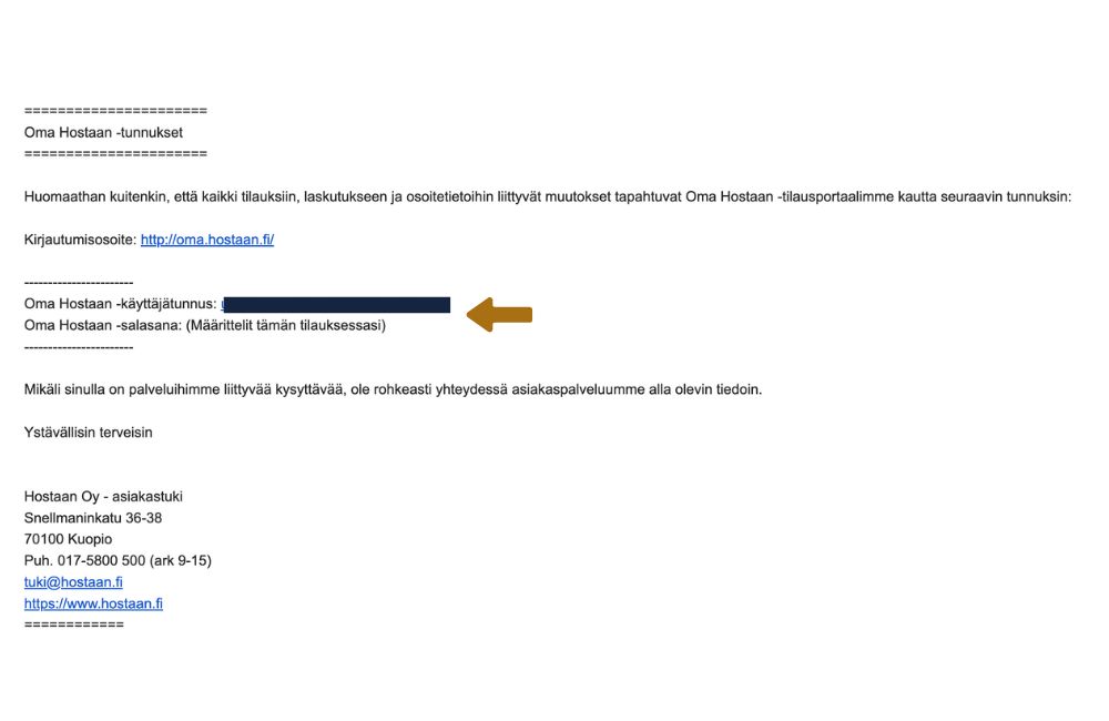 2. Tunnukset palveluun, joka tulee kun Hostaan on ehtinyt käsitellä tilauksen ja luoda tunnukset