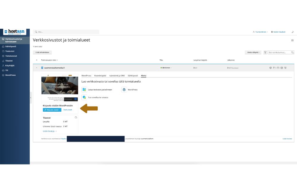 Itse hallintapaneeli näyttää selkeältä ja ainakaan itse harvoin käyn näissä hallintapaneeleissa. Kirjaudun suoraan kirjautumissivun kautta WordPressiin ja siinä se. Mutta täällä voit käydä katsomassa ja tutkimassa miltä hallintapaneeli näyttää. Täältä pääset myös kirjautumaan WordPressiin (nuolen osoittamasta kohdasta).