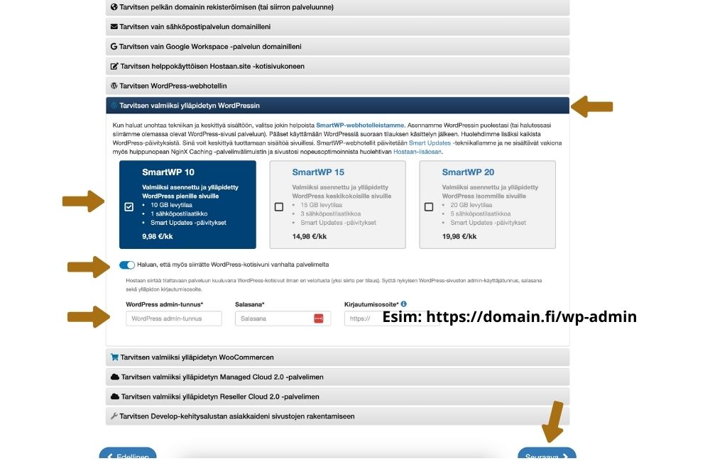 Lisää omat WP tunnuksesi sille varattuun kohtaan sekä kirjautumissivun osoite, joka on tyypillisesti sinun domain + pääte + wp-admin. Sitten vain klikkaa alalaidasta ”Seuraava”.