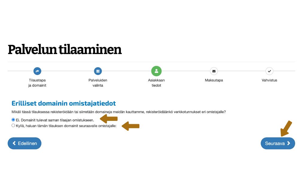 Seuraavalla sivulla valitset domainien omistajat. Esimerkiksi, jos olet myymässä sivustoa eteenpäin, tässä kohtaa on tärkeää ilmoittaa, että domainit tulevat toisen henkilön tai yrityksen omistukseen. Omalla kohdalla domain jää kuitenkin minun käyttööni, joten klikkasin vain ”Ei” ja sitten ”Seuraava”.