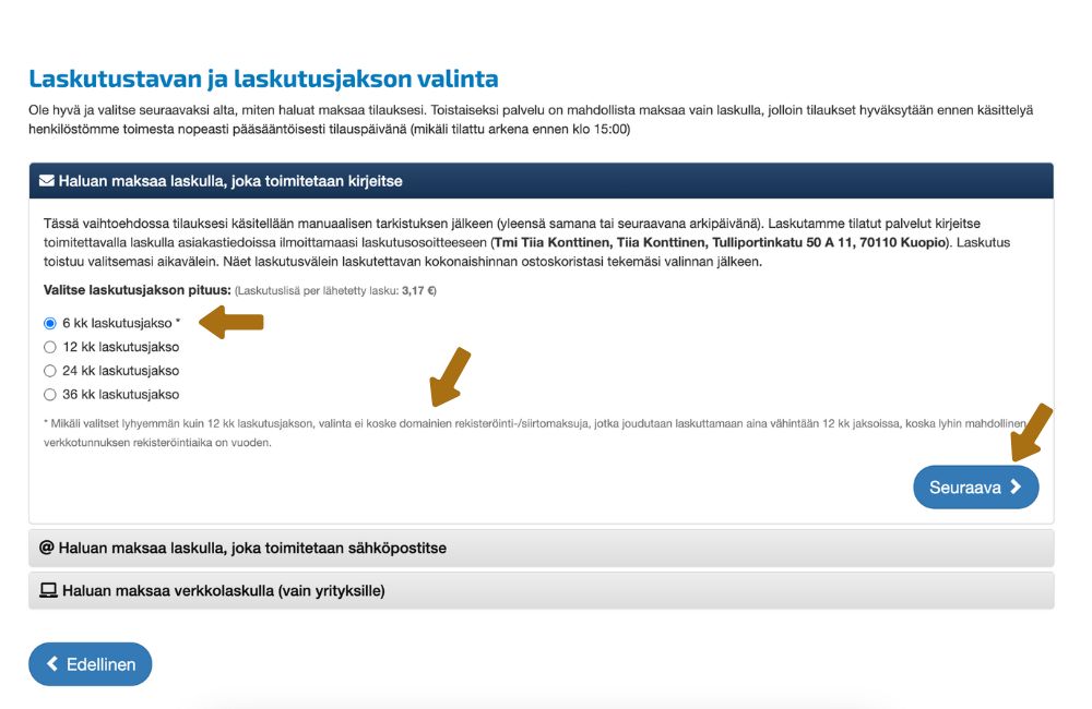 Sitten pääset valitsemaan laskutusjakson. Valittavana ovat 6 kk, 12 kk, 24 kk tai 36 kk. Huomioi kuitenkin, että laskutusjakso on vain webhotellille ja jos valitset 6 kk laskutusjakson, domain veloitetaan vuodeksi kerrallaan. Kun olet tehnyt valintasi, klikkaa ”Seuraava”.