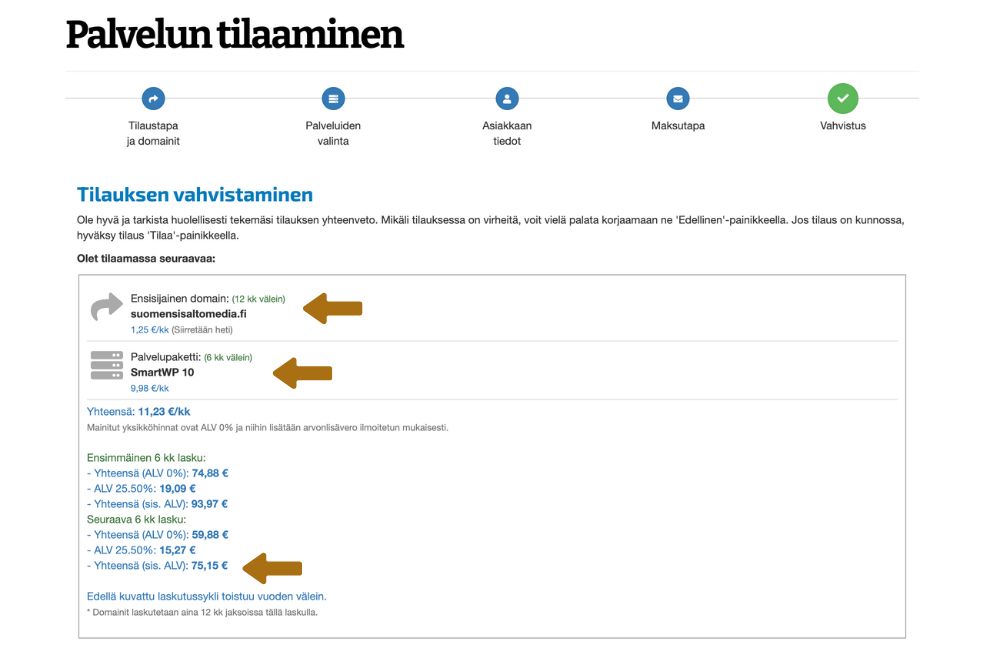 • Ja laskutusjakso on oikein (ja huomioi domainin minimilaskutus kausi, joka on 12 kk)